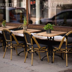 No café table without matching café chairs, and that is why we also offer a wide selection of indoor chairs for café and restaurant and outdoor café chairs of high quality at reasonable prices. You can find chairs that match your tables, so you achieve an even more complete decor. Our chairs and tables are made to last, so you can be sure that you will enjoy your café or restaurant furniture for many years to come. Additionally, our products are generally easy to maintain and clean. Our consultants are happy to help you choose the right chair for your café. If space is tight, our foldable tables and stackable chairs offer a practical and flexible solution, as they are easy to move around or store away when not in use. Just like our café tables, foldable tables and stackable chairs are also available in various materials, sizes, and shapes to suit your decor needs.