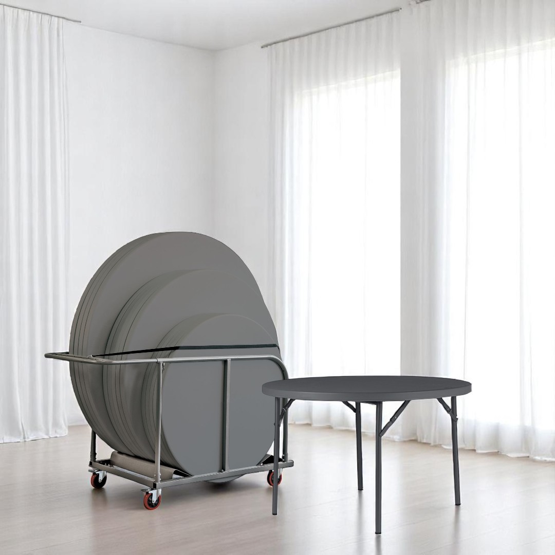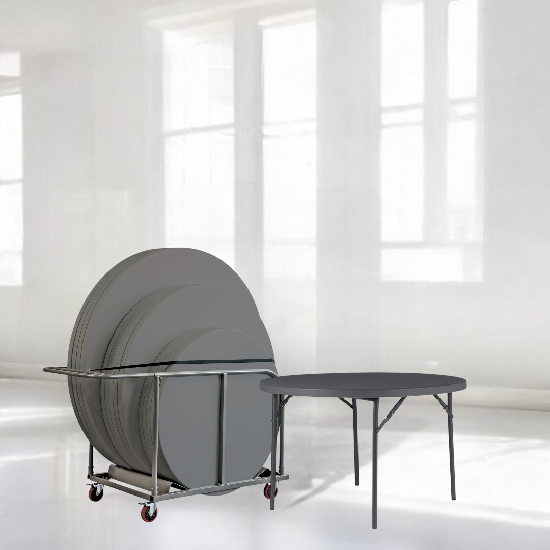 Gør opbevaring og opsætning let og professionel med denne sampakke, som består af 15 Zown Planet runde klapborde med diameter på 120 cm og en gratis specialdesignet bordvogn til nem transport og pladsbesparende opbevaring. Perfekt til fester, konferencer, hoteller og udlejning, hvor både æstetik og funktionalitet er vigtig.