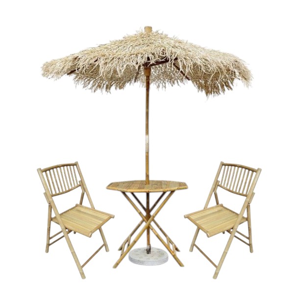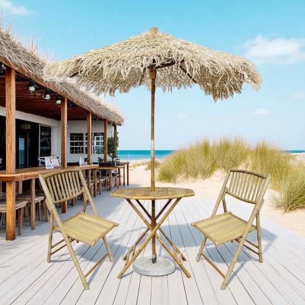Skab en indbydende og atmosfærisk udendørsoplevelse med denne komplette bambuspakke, bestående af 2 bambusstole og en tilhørende parasol med bord. Ideel til professionelle miljøer, hvor æstetik, funktionalitet og holdbarhed er i fokus.