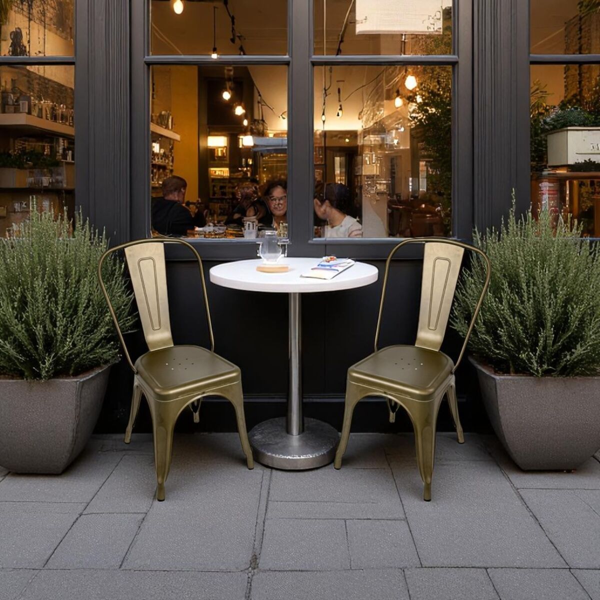 Add industrial charm and functional durability to your outdoor area with this bistro chair made of powder-coated metal. With its iconic and raw look, the chair is an obvious choice for cafés, restaurants, events, and terraces where both style and durability are essential.