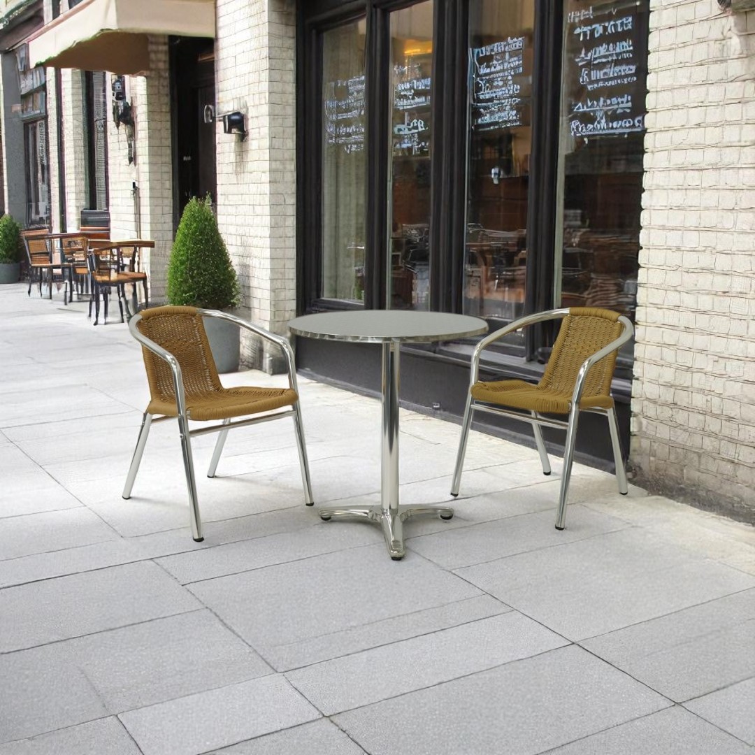 Let, men stabilt understel i børstet aluminium. Tidløst og rustbestandigt – ideelt til udendørs cafédrift.