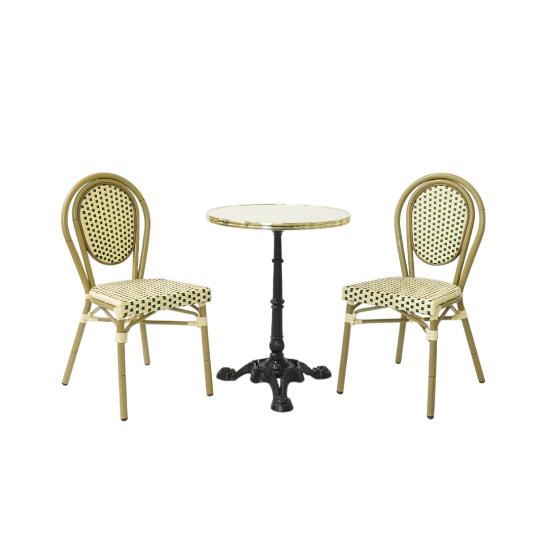 Cafépakke Paris i grøn-beige giver dig en komplet løsning med to caféstole, rund bordplade og understel – alt i høj kvalitet, harmonisk design og til en fordelagtig pakkepris.