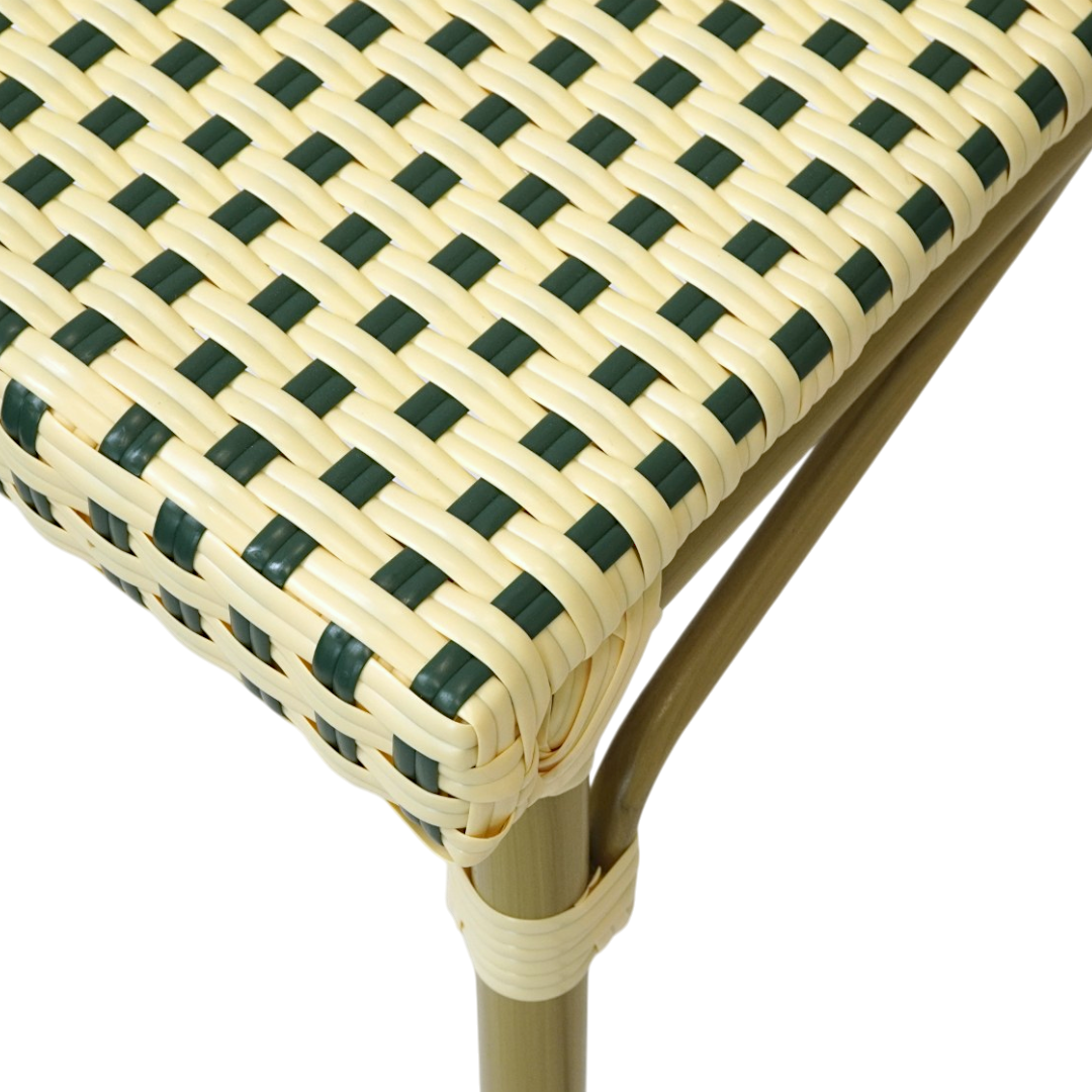 Smukt design med elegant flet i grøn-beige. Fremstillet i holdbart polyrattan og pulverlakeret stål. Vejrbestandige, stabelbare og perfekte til både ude- og indendørs caféområder.