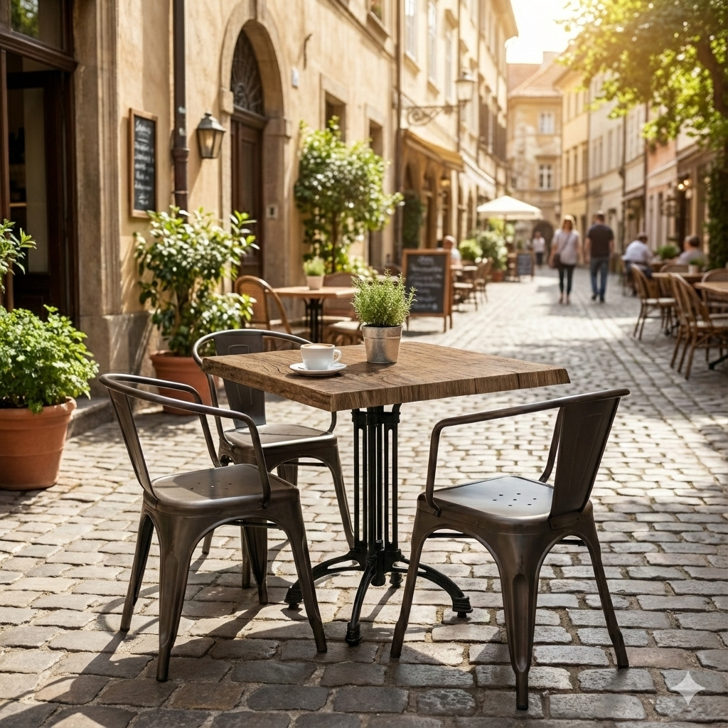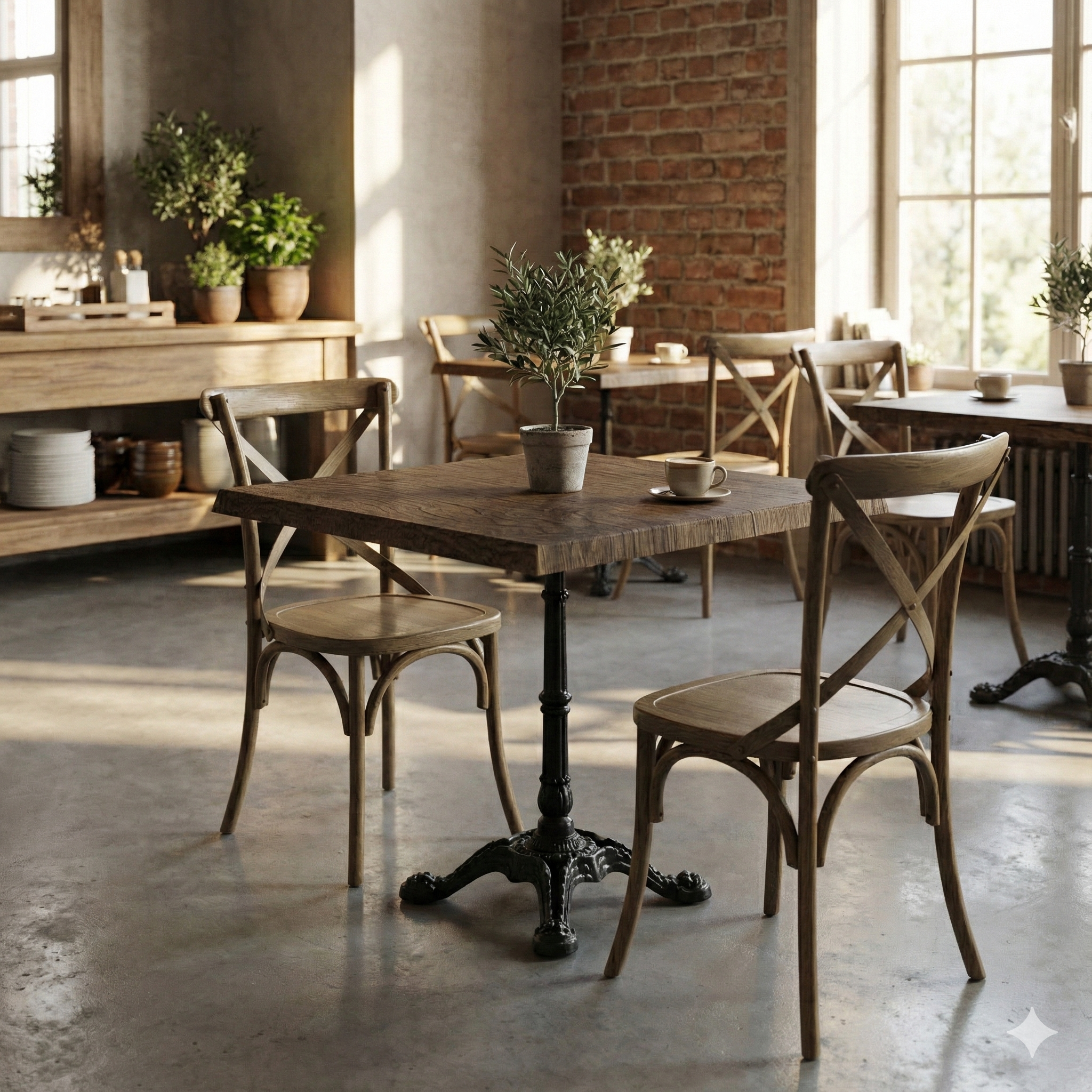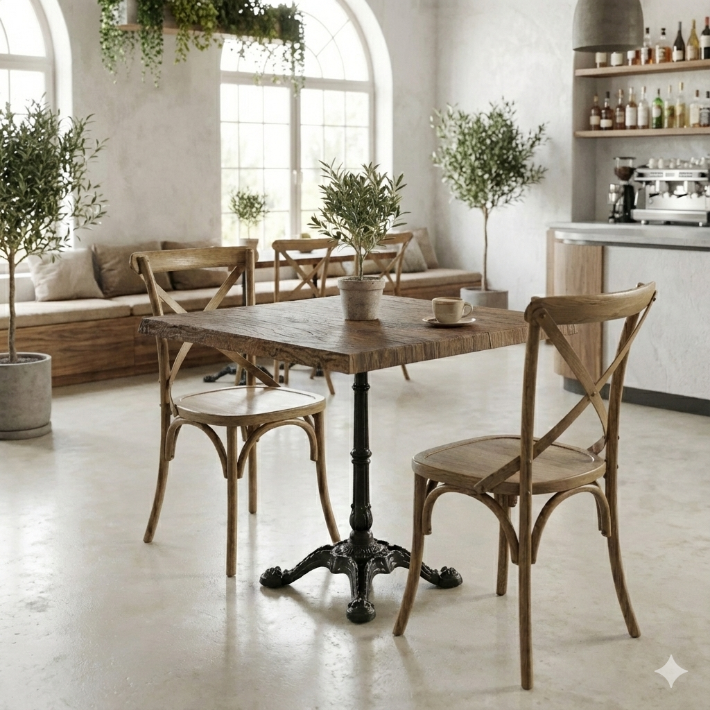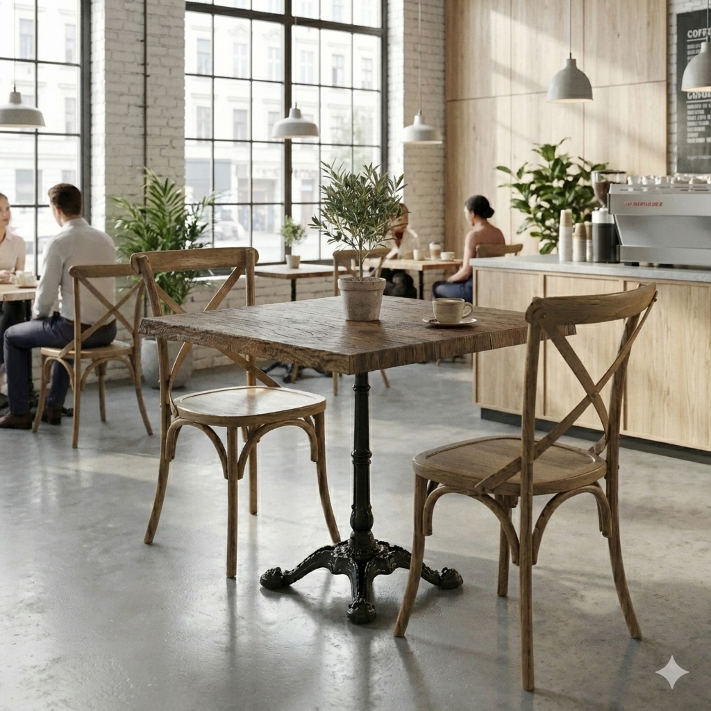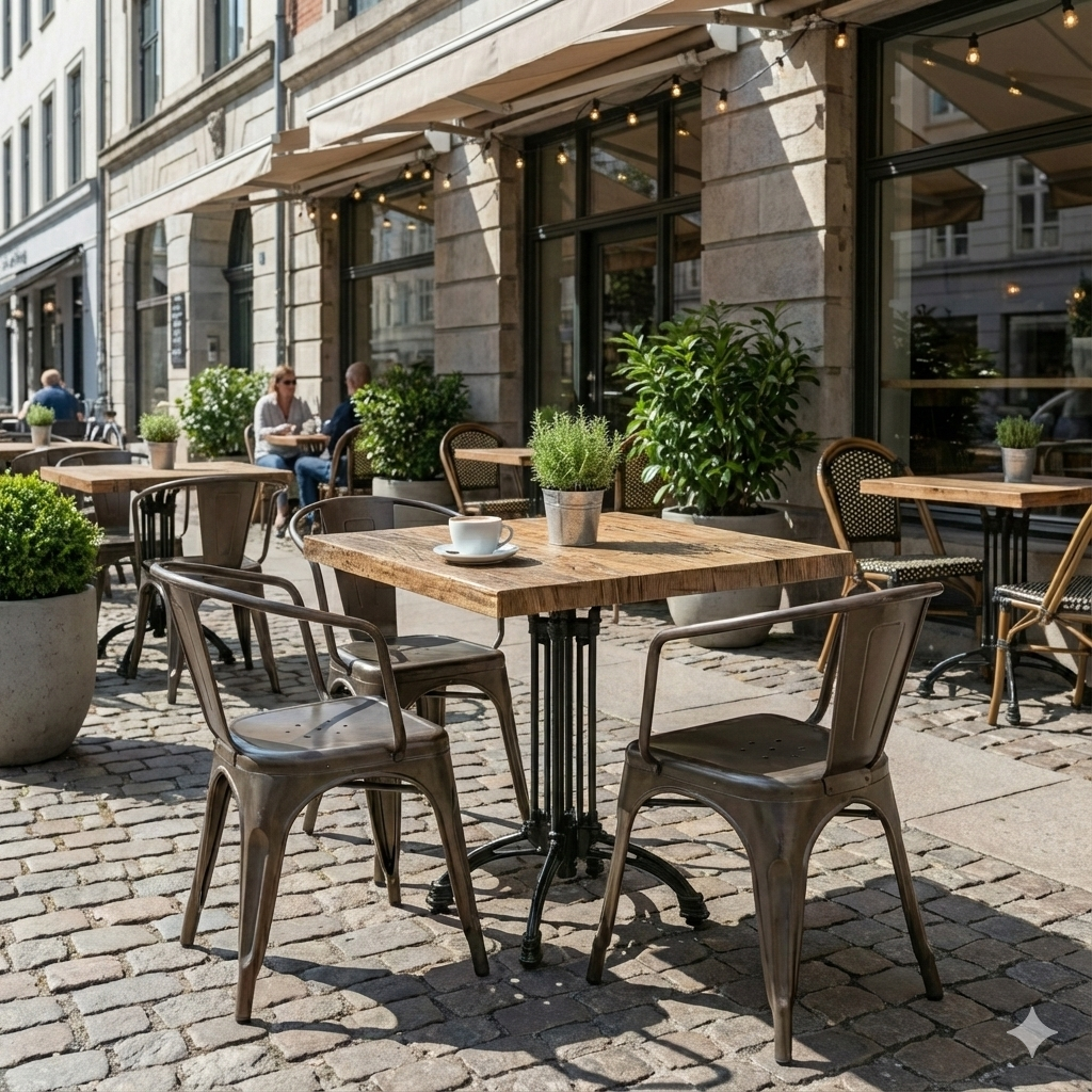 The tabletop is made of heat-pressed laminate and designed for intensive commercial use. The surface combines the aesthetics of wood with the practical properties of laminate: high durability, resistance to moisture and stains, as well as easy cleaning in daily operation. This ensures a reliable solution with low maintenance – also in environments with high traffic and frequent guest turnover.