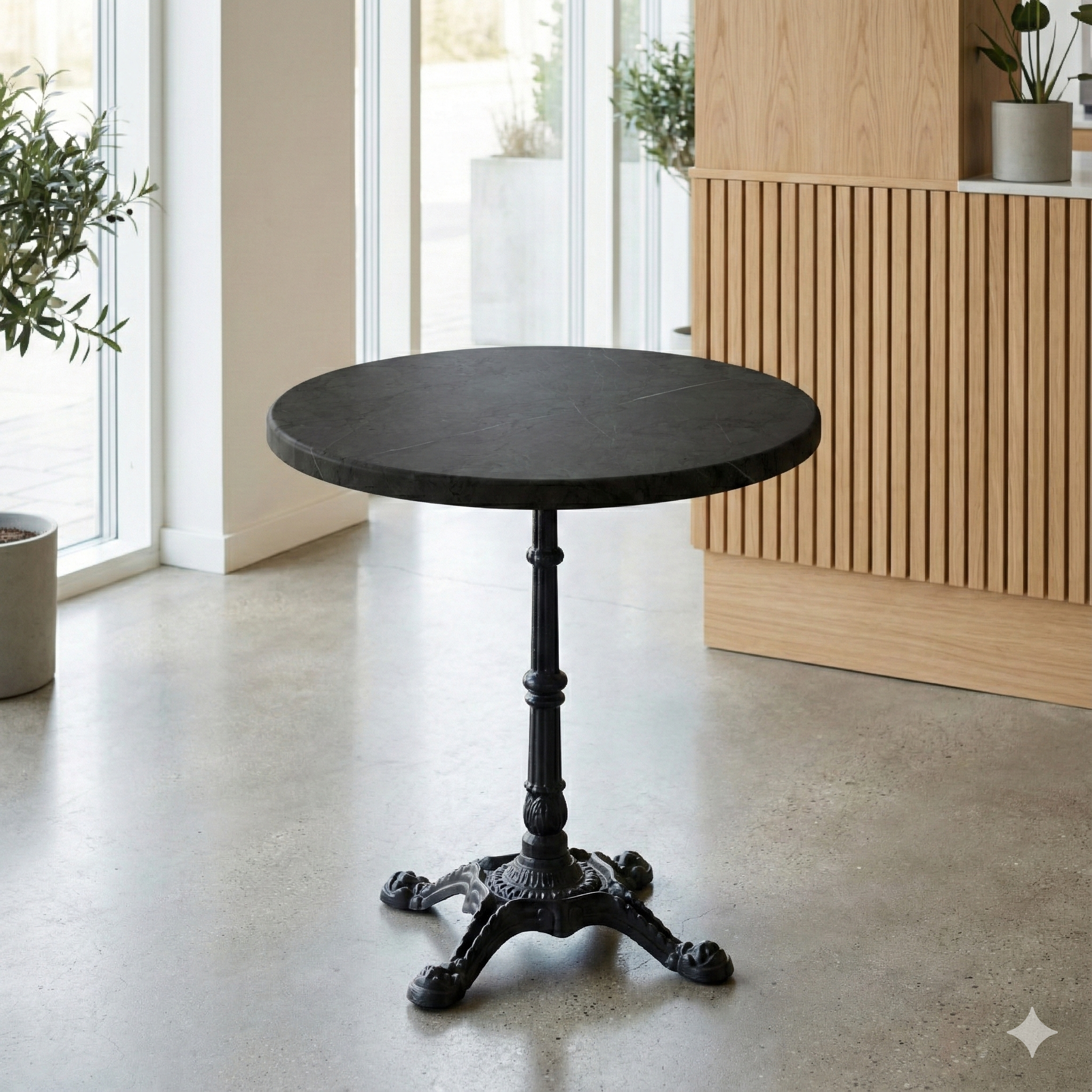 This round tabletop in gray marble look is a functional and stylish choice for cafés, restaurants, hotels, and event areas where both design and operational reliability are the focus. The dark, elegant marble-inspired expression creates an exclusive atmosphere, which fits particularly well with modern interiors and contrast-rich environments.