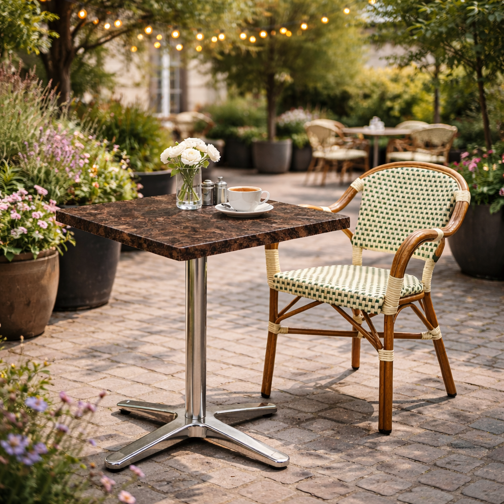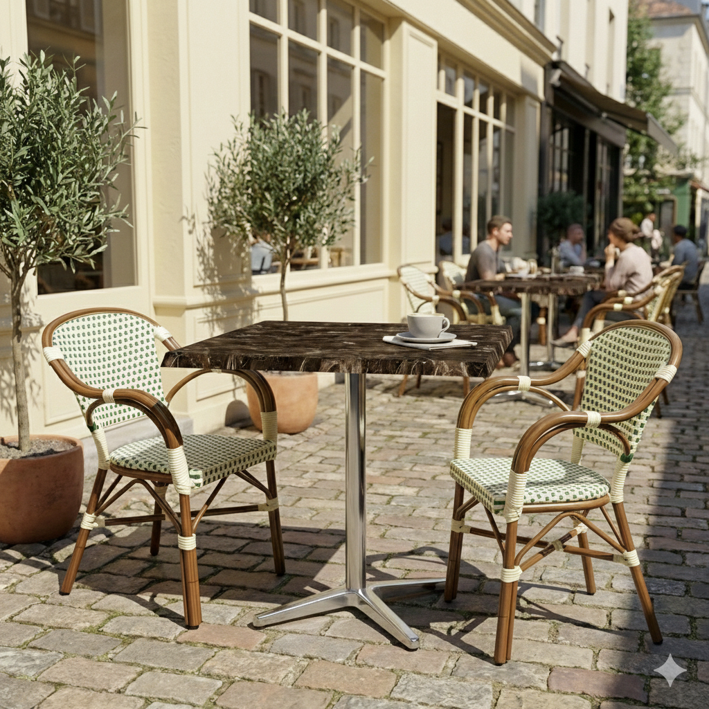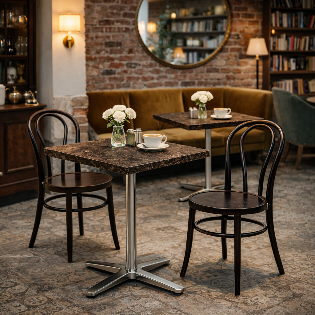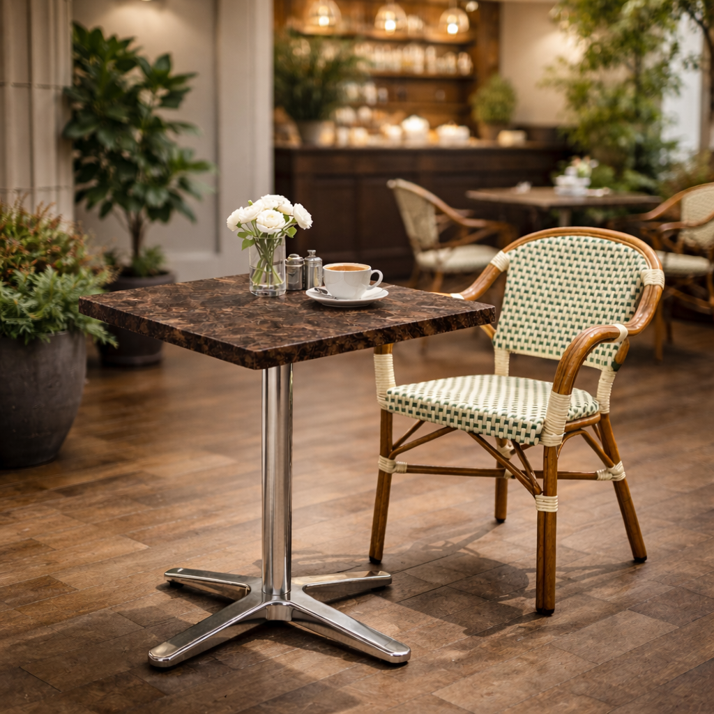 This square Karacabey tabletop in dark marble look is an elegant and reliable solution for cafés, restaurants, hotels, canteens, and lounge areas where a warm and exclusive expression is desired. The deep brownish marble look with natural veins adds character and calm to the table setup and works particularly well in both classic and modern interiors.