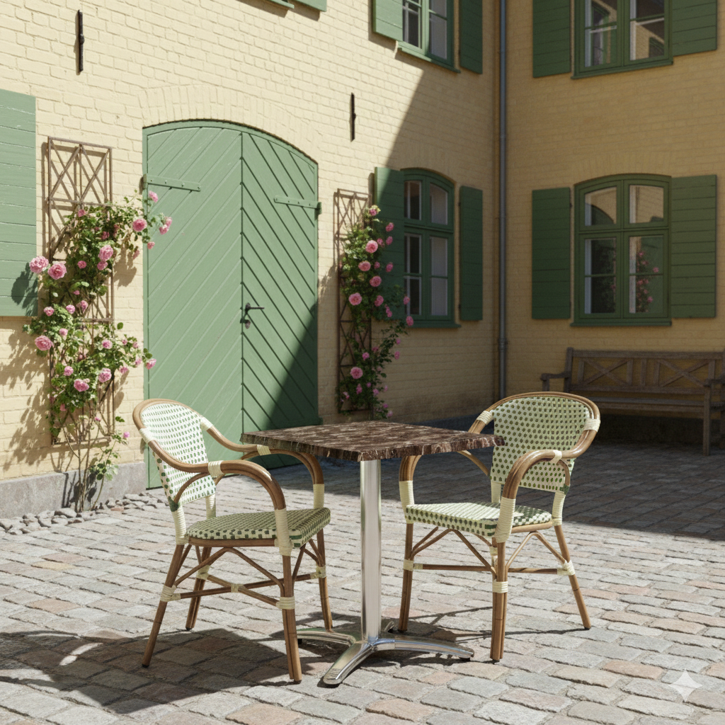 The tabletop is made of heat-pressed laminate and designed for intensive commercial use. The surface combines the visual depth of marble with the practical advantages of laminate: high wear resistance, resistance to moisture and stains, as well as easy cleaning in daily operation. It ensures a professional solution with low maintenance and high operational reliability – also in environments with many guests.