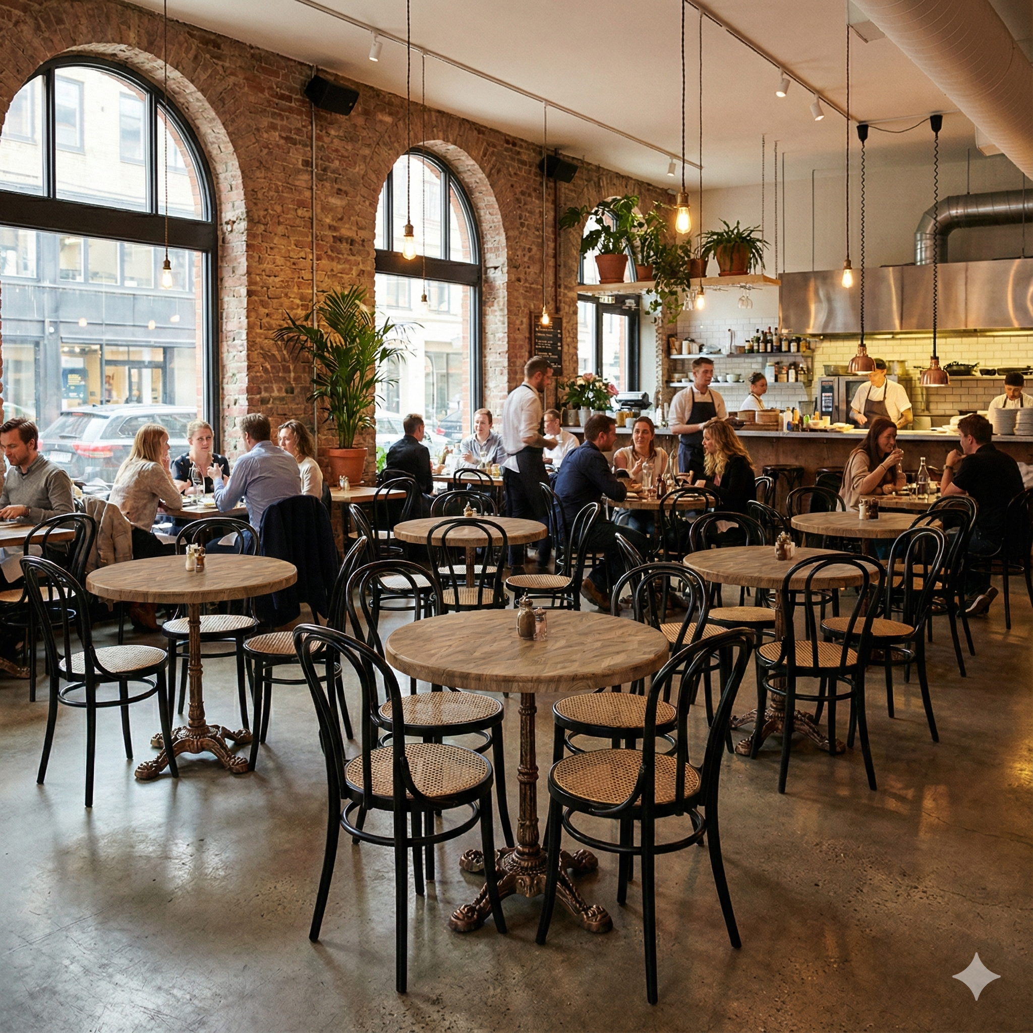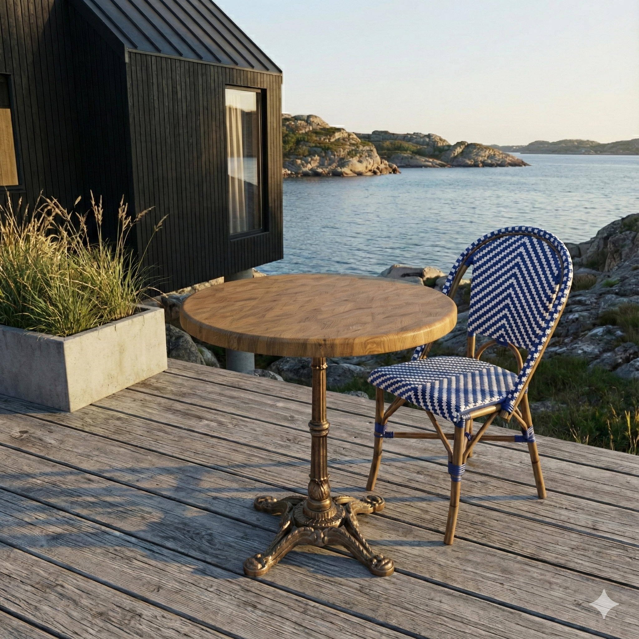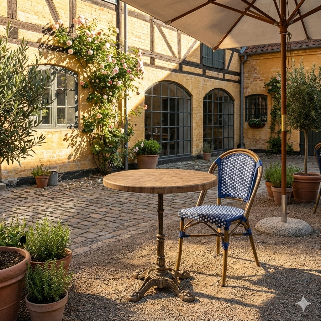 The round shape supports a flexible and social table arrangement that contributes to a pleasant guest experience and efficient use of space. A reliable solution for professionals who want a bright wood look with low maintenance and long lifespan – both indoor and outdoor.