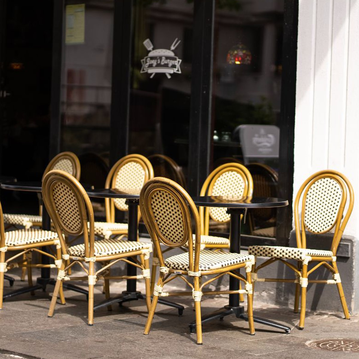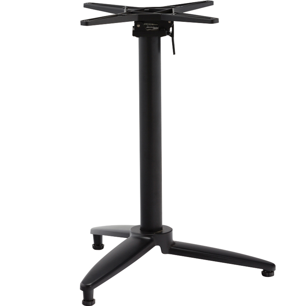 Smart underframe for café tables in powder-coated aluminum. Designed so that the tabletop can be tilted up to a vertical position and the tables can be assembled for space-saving storage.