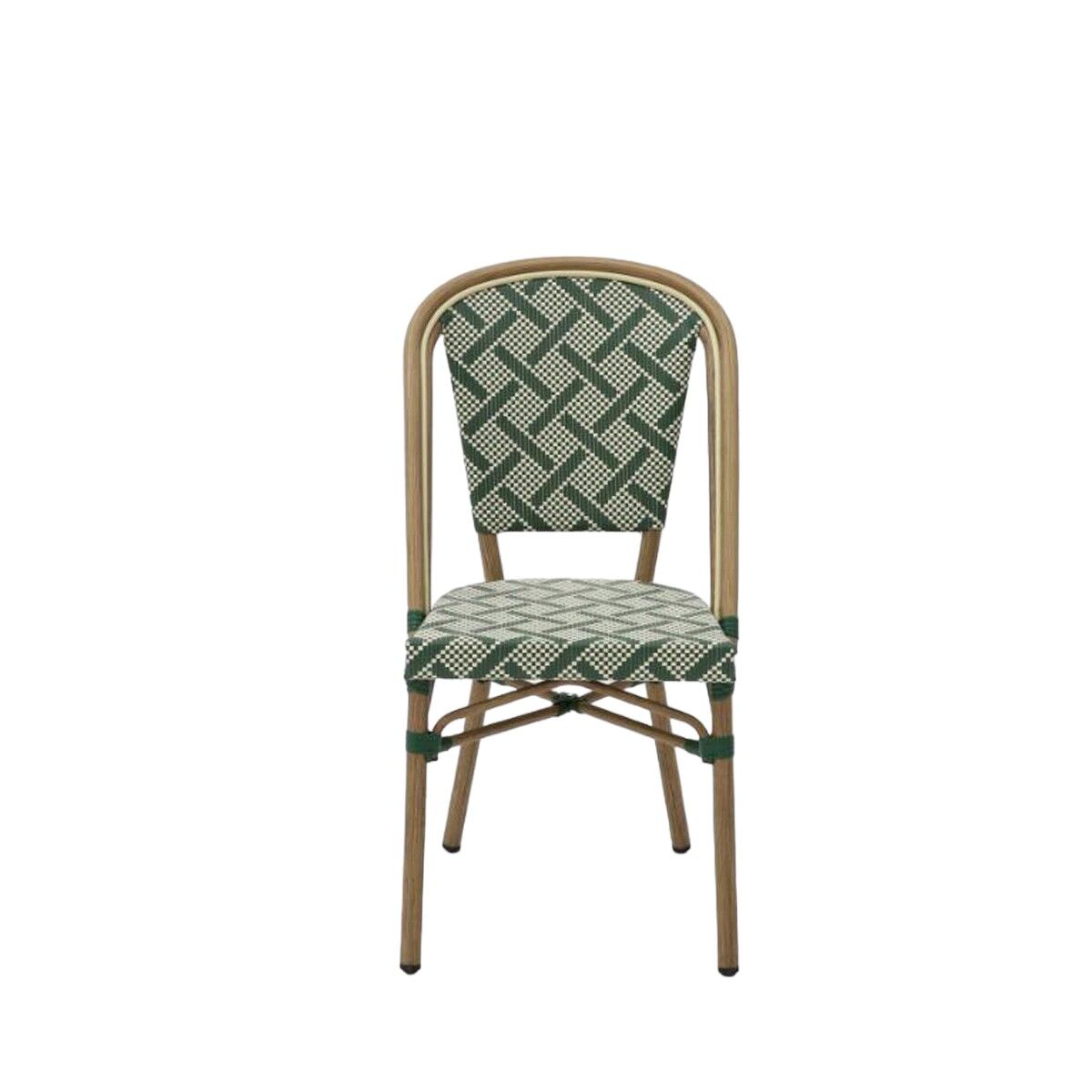 The Metz Café Chair in Textylene combines classic French bistro design with modern materials, making it ideal for professional environments such as cafés, restaurants, hotels, and outdoor serving areas. With its eye-catching green and white patterned weave and bamboo-like aluminum frame, the Metz chair offers both charm and practical value.