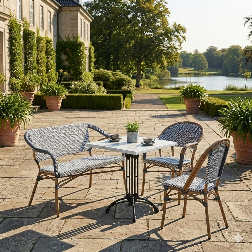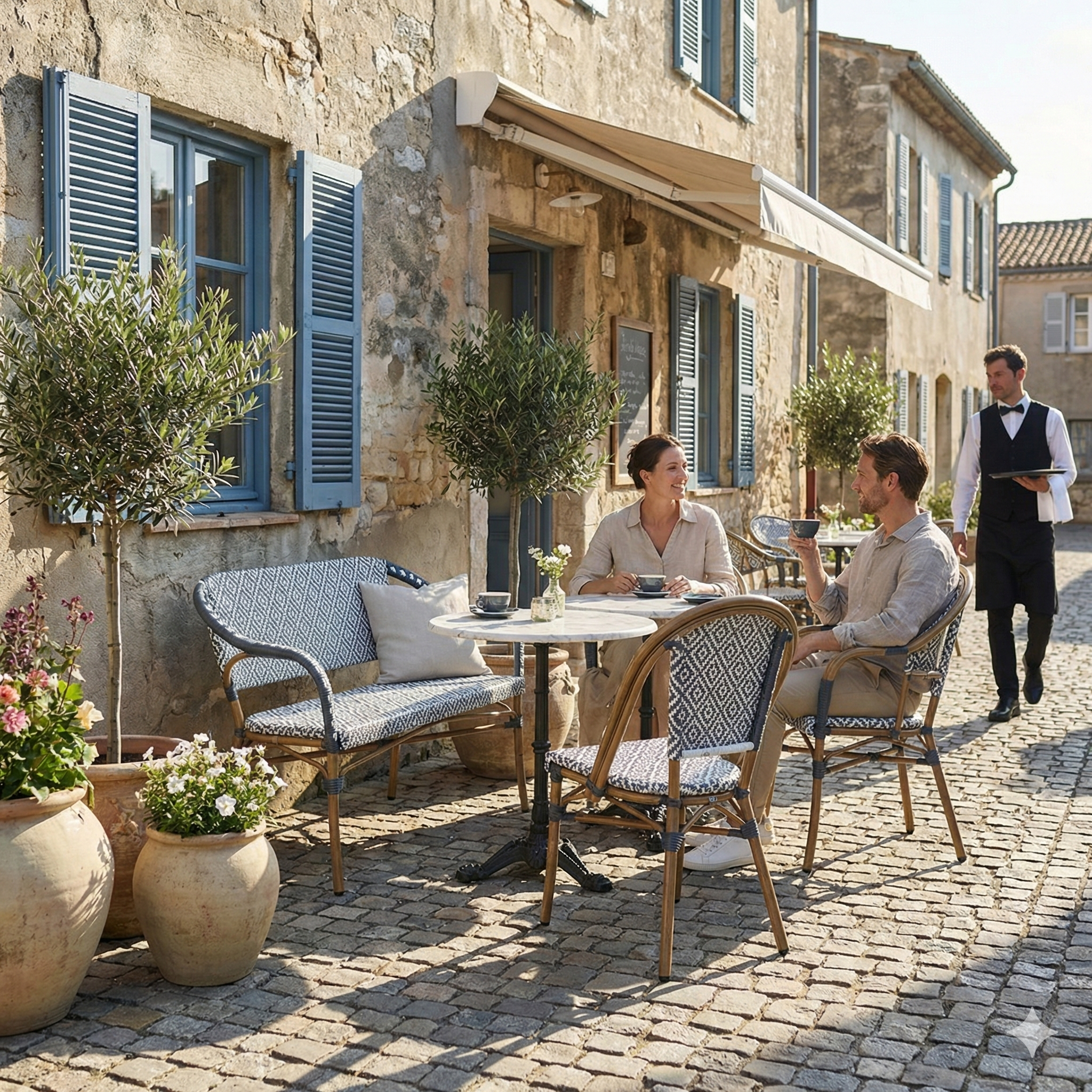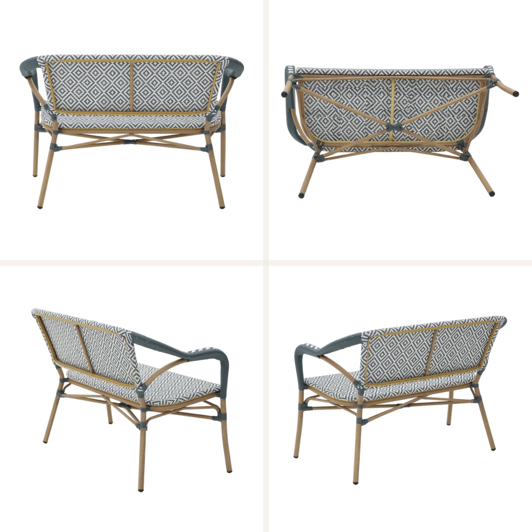 The frame is made of aluminum with a bamboo look. It provides a lightweight and rust-free frame that is easy to handle in daily operations, while the visual expression fits naturally into classic cafe and bistro interiors. The bench is constructed without movable parts, which contributes to high stability and reduces the need for service and repair.