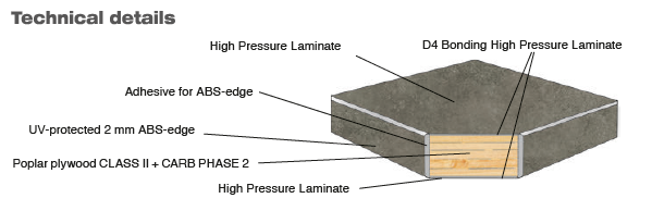 - Moisture and weather resistant – Made of moisture-resistant plywood and coated with a durable HPL surface.