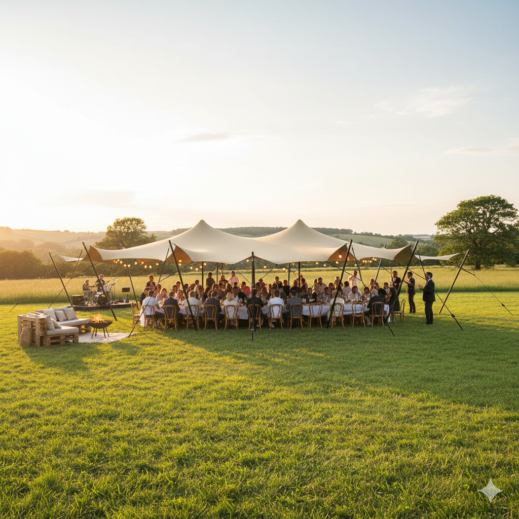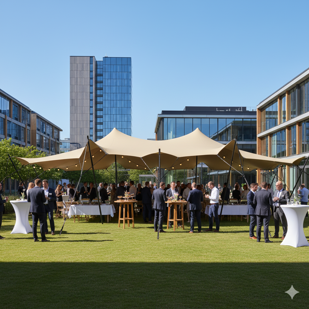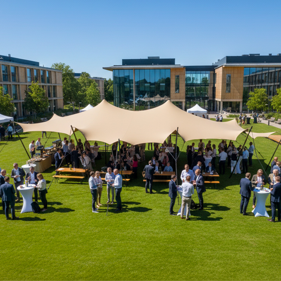 This Stretch Tent complete at 9×9 meters in sand color is a popular solution among professionals. With its durable material and flexible setup, it is a reliable and aesthetic covering for both small and large events.