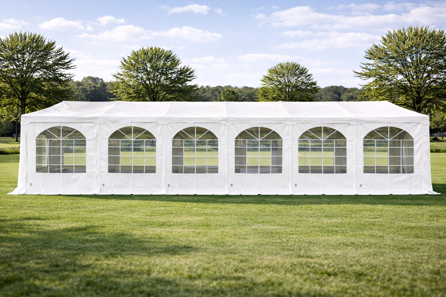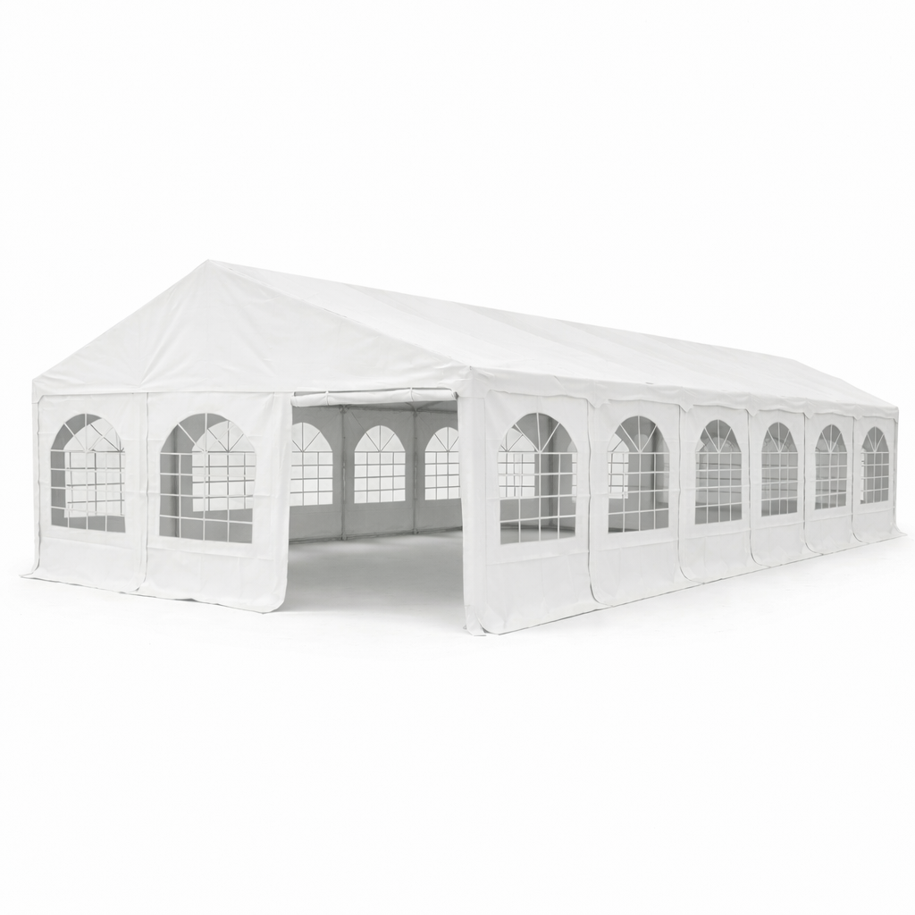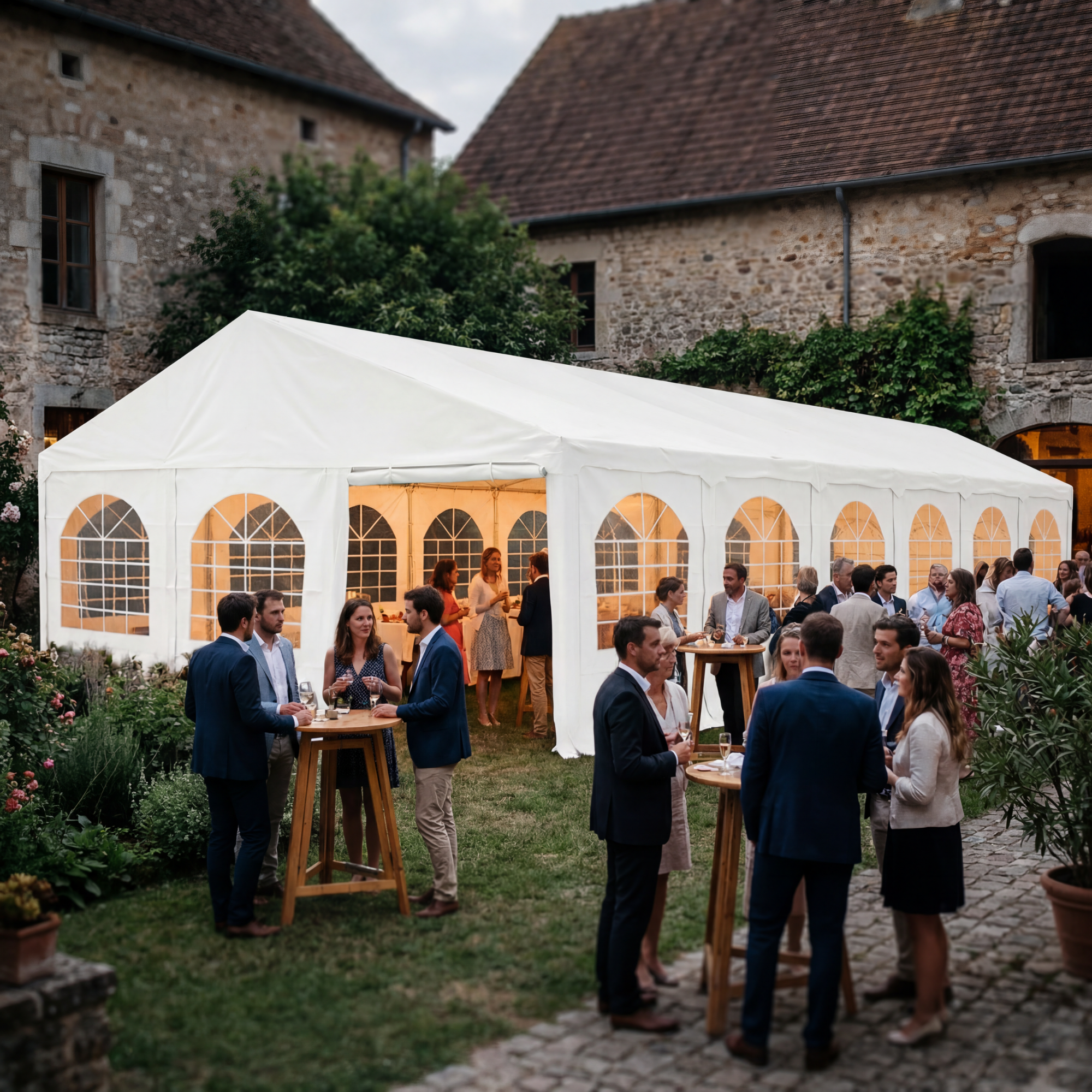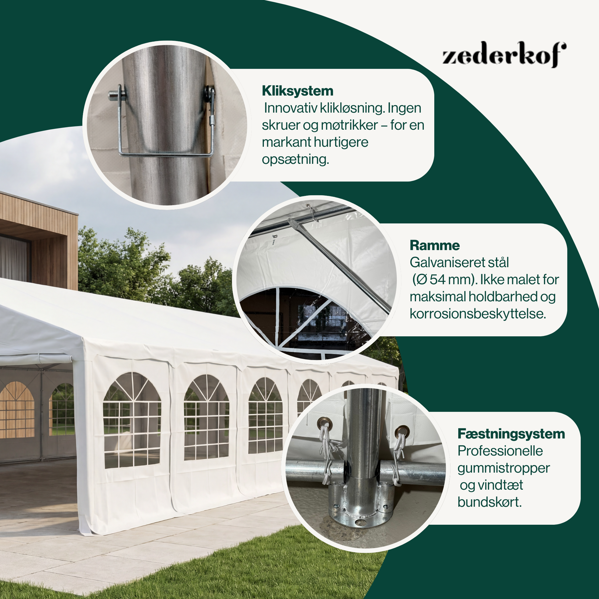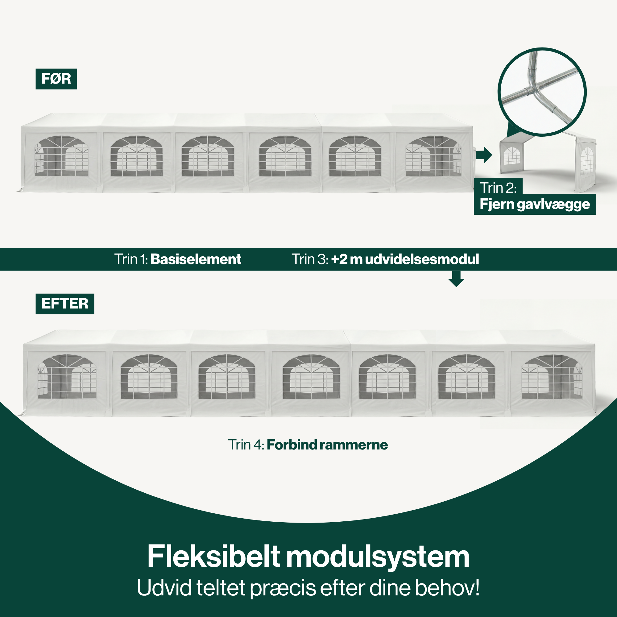 The construction is made of extra heavy galvanized steel for high durability with repeated use. Strong rubber straps, solid ground spikes, and an integrated ground skirt ensure stability and reduce wind intrusion. The extra heavy tent fabric is flame retardant and certified according to DIN 4102 B1, making the solution suitable for both private and public events. The modular system makes it possible to extend the tent with 6×2 meter extension sections as needed.