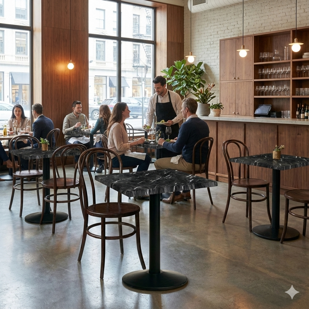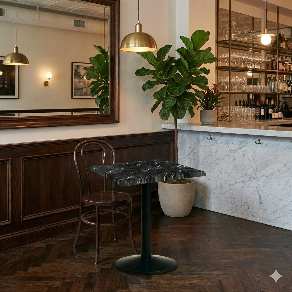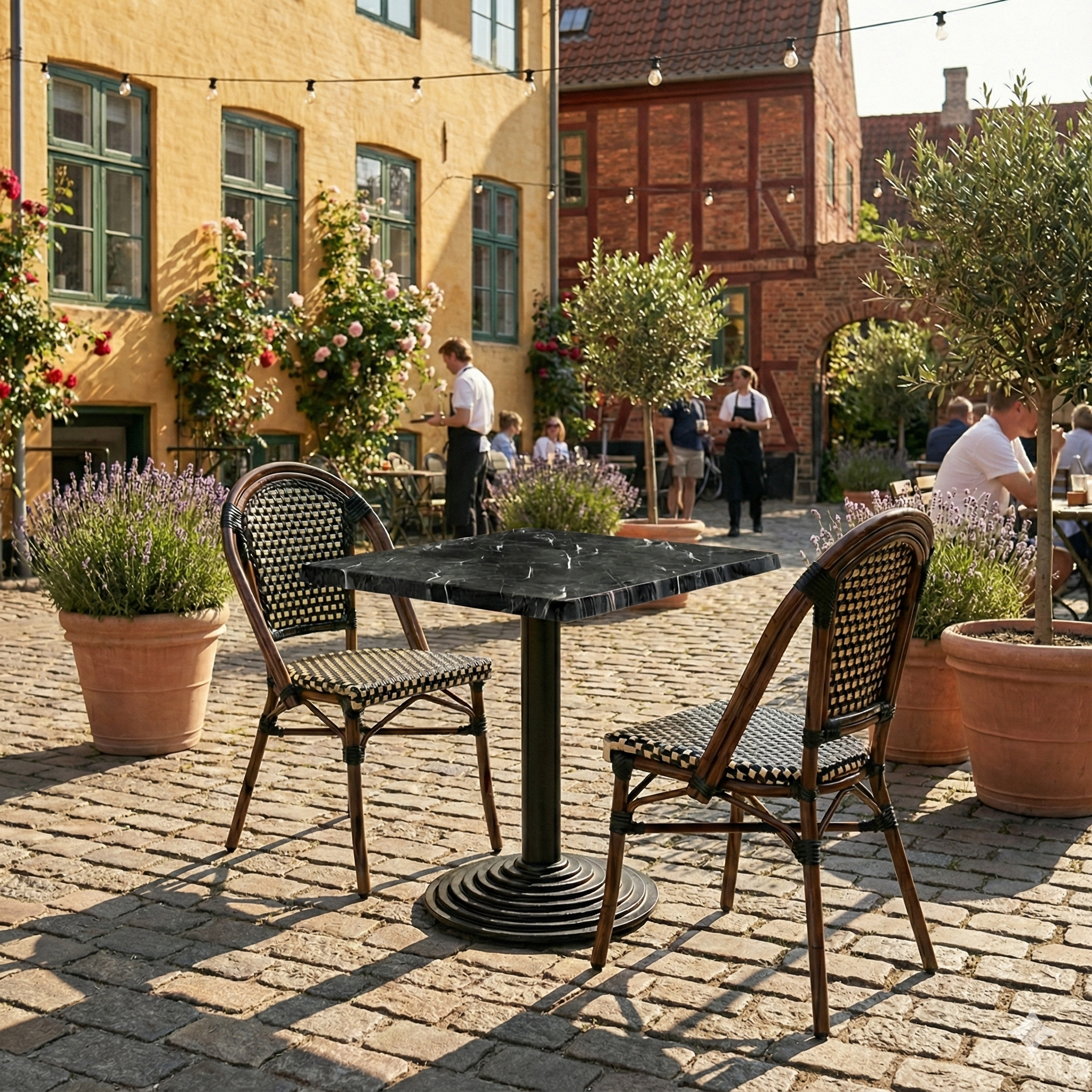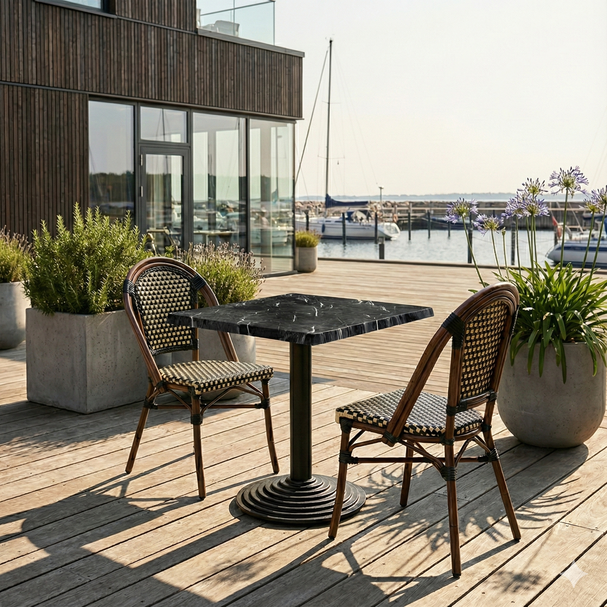The tabletop is made of heat-pressed laminate and developed for intensive commercial use. The surface provides the visual expression of marble, but with the practical advantages of laminate: high wear resistance, resistance to moisture and stains, as well as easy cleaning in daily operation. This ensures a reliable solution with low maintenance – also in environments with high guest traffic.