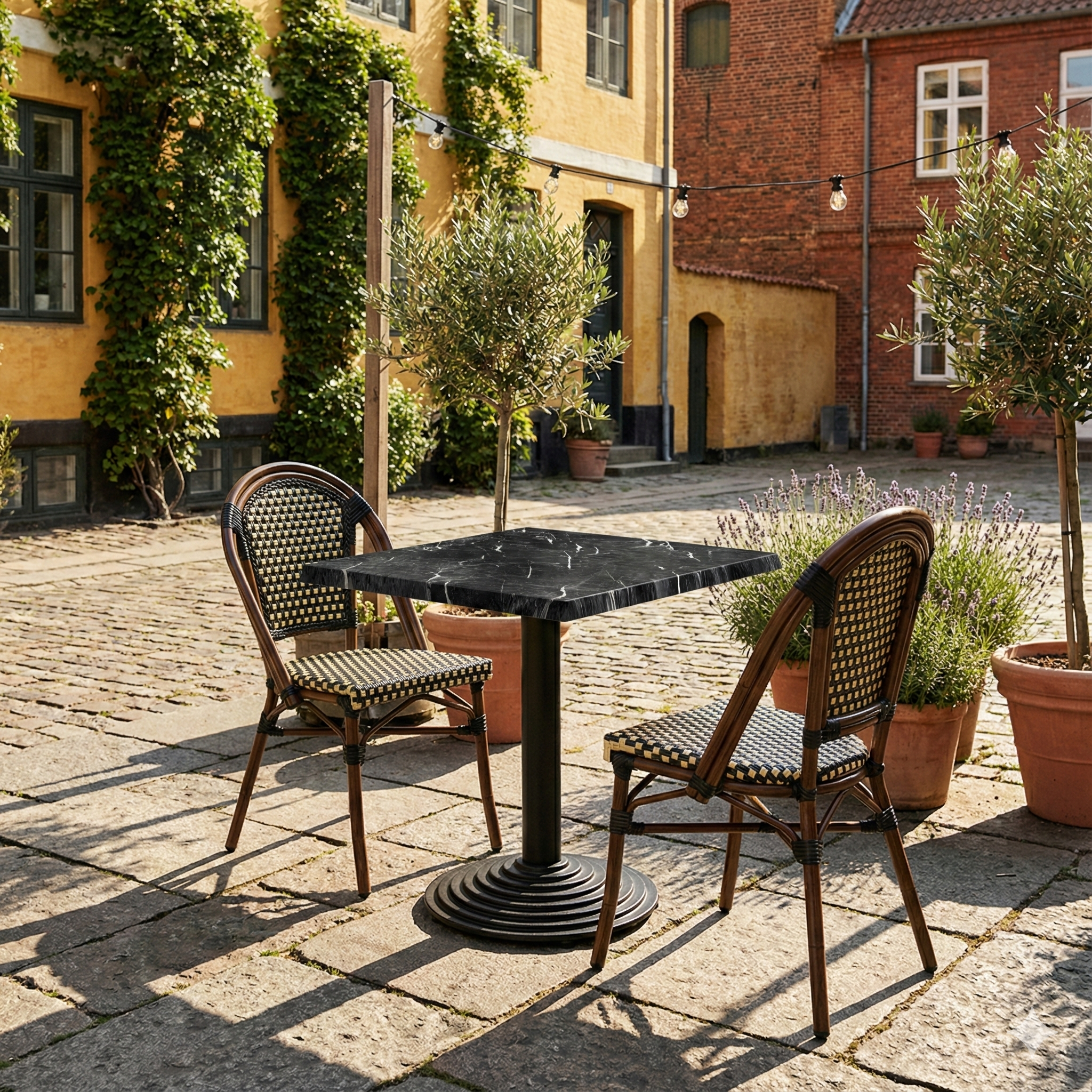 This square Teramo tabletop in dark marble look is an exclusive and distinctive choice for cafés, restaurants, hotels, canteens, and lounge areas where design and durability must go hand in hand. The deep, black marble expression with light veins adds character and a luxurious touch to the space, which works particularly well in modern and contrast-rich interiors.