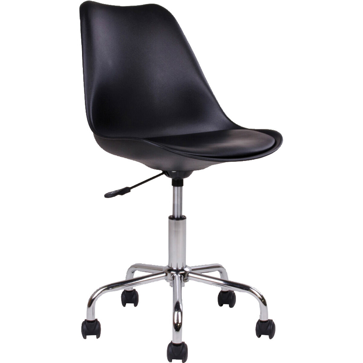 Victoria is a classic and simple office chair made of molded plastic with a seat of artificial leather, giving the chair a classic look. The frame is made of chrome. The office chair has 5 black wheels and is therefore very stable.