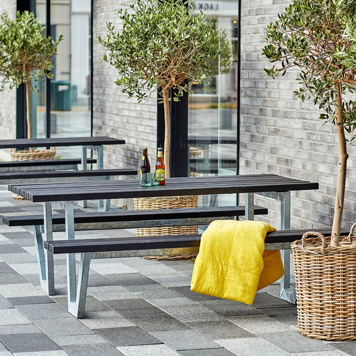 The urban and simple WEGA table and bench set is a solid outdoor furniture piece made from sturdy materials. The galvanized steel in the angular and open construction combined with robust planks emphasizes the furniture’s functionality and draws on threads of architectural building and design style in its form.
