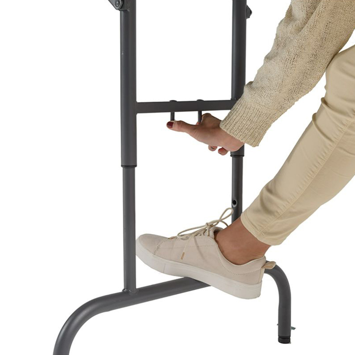 In addition, the table stands out due to its ergonomic design and high user-friendliness. The foldable table can be adjusted to the 3 height positions of 85.1 cm, 90.2 cm, and 94.3 cm, ensuring the correct working height for standing work. The foldable table is suitable for classrooms, office environments, conferences, trade shows, and similar professional events. Multiple tables can also be connected using the built-in patented locking system.
