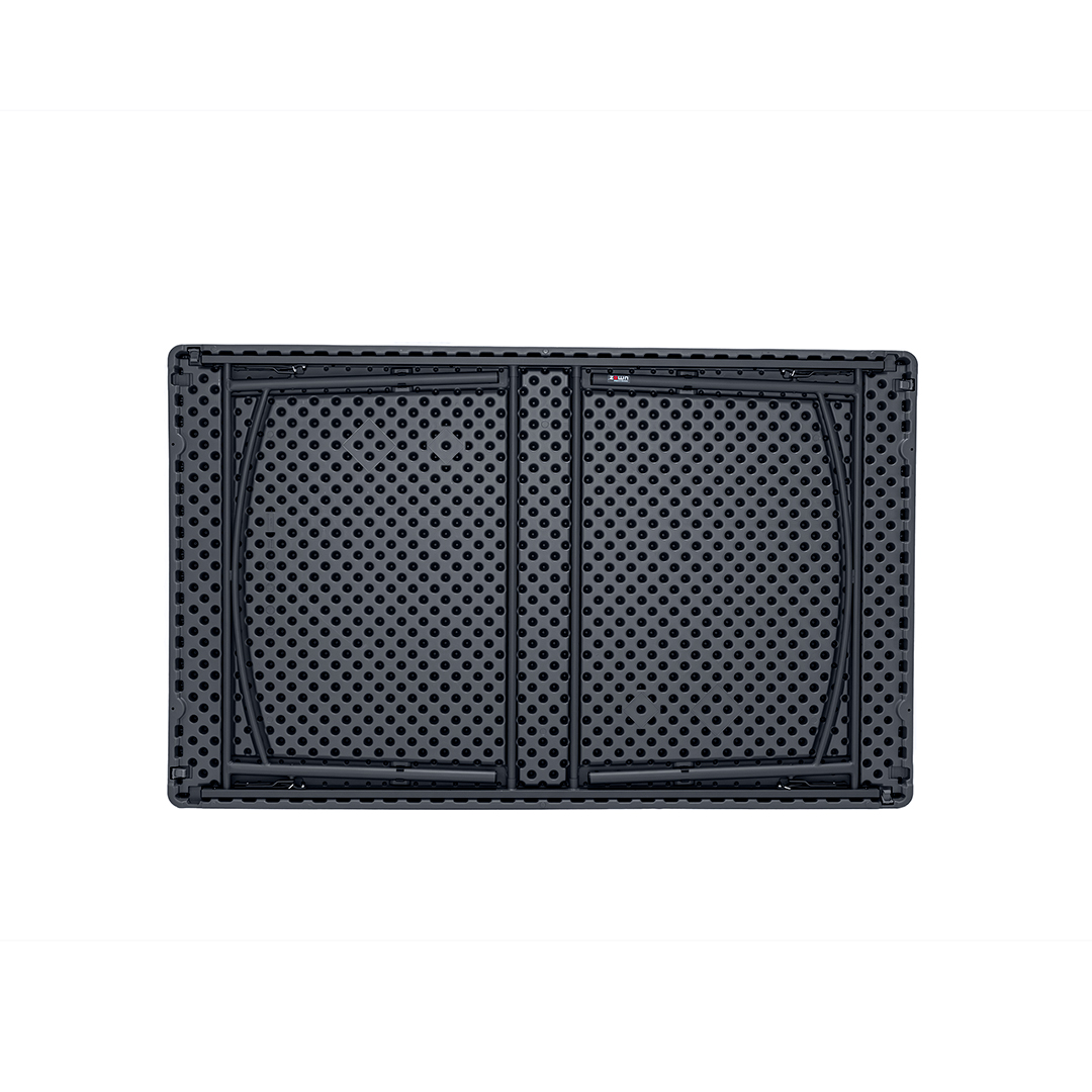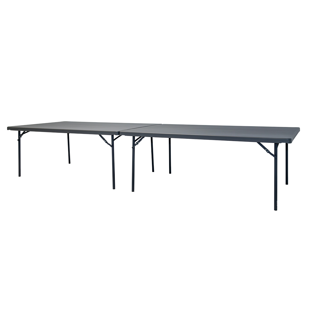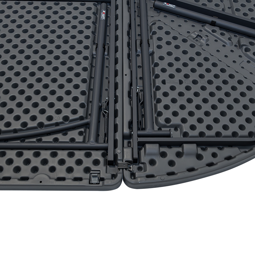 The tabletop is made of 100% pure plastic (HDPE), which provides high durability and makes the table easy to clean in busy professional environments. The frame is made of solid steel tubes, and the manual locking mechanism is both smooth and secure with integrated rings that reduce the risk of accidental folding. The result is a stable and reliable table, ideal for professional settings.