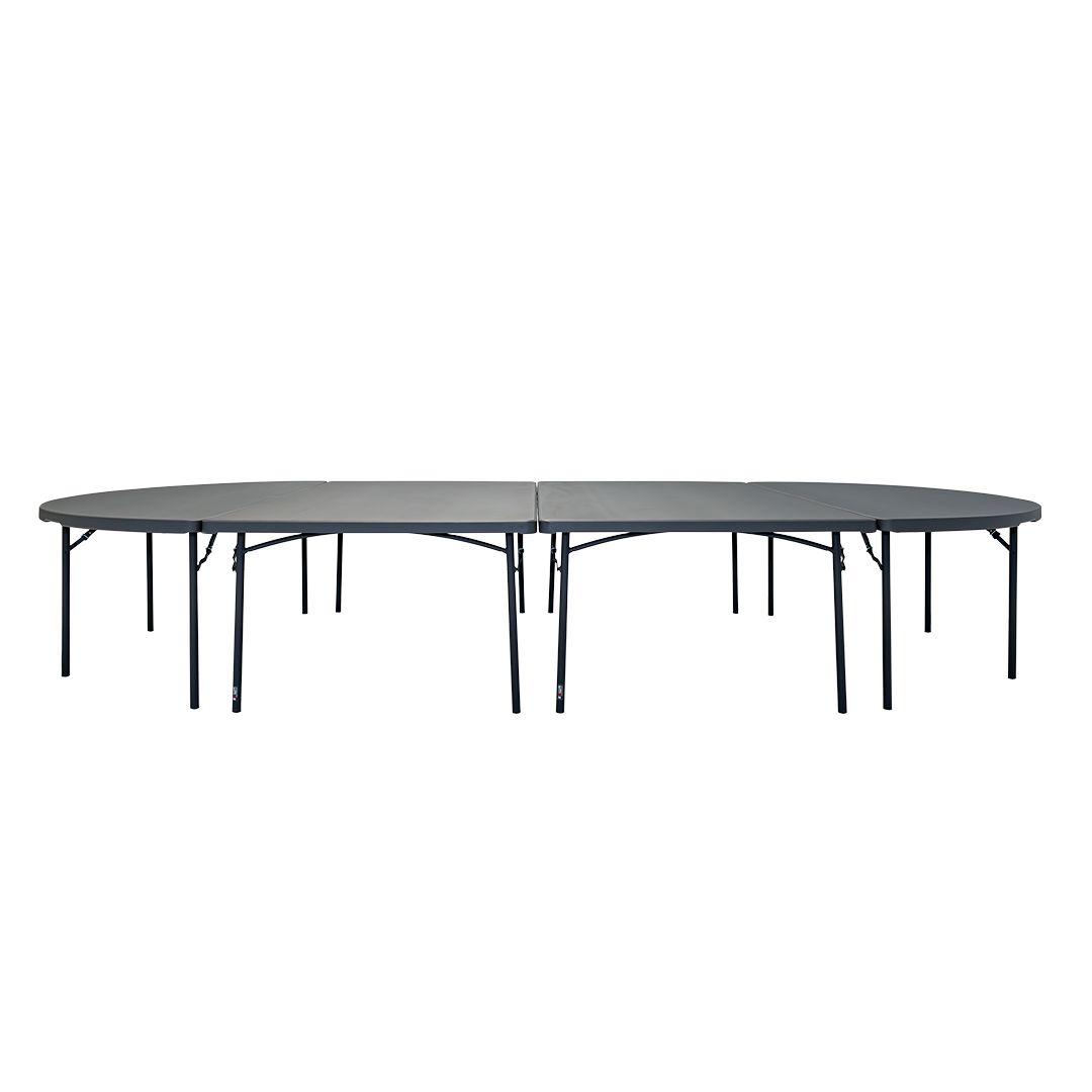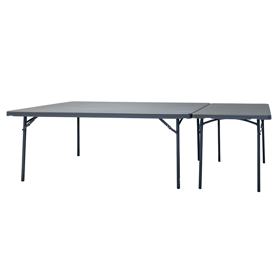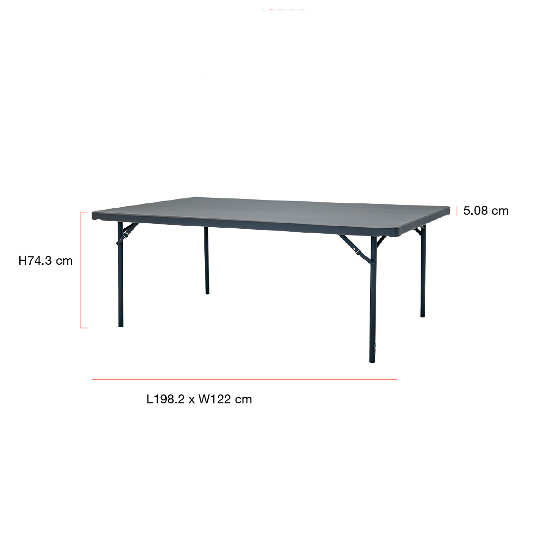 The tabletop is made of 100% pure plastic (HDPE), which provides high durability and makes the table easy to clean in busy professional environments. The frame is made of solid steel tubes, and the manual locking mechanism is both smooth and secure with integrated rings that reduce the risk of accidental folding. The result is a stable and reliable table, ideal for professional settings.