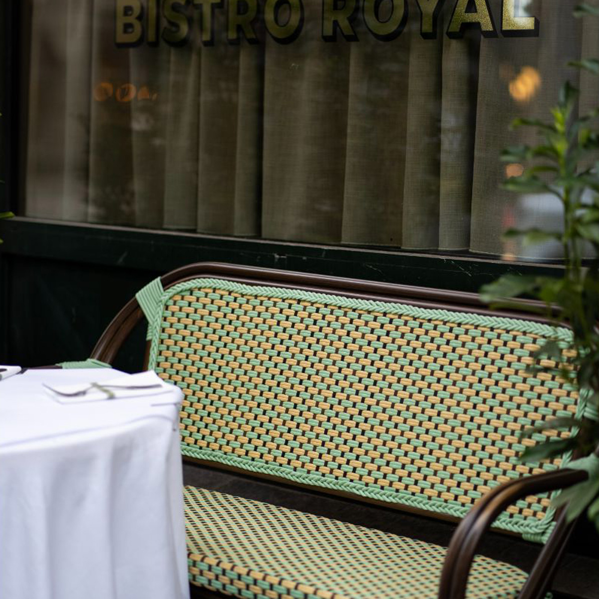 A classic café bench, which is delivered with a beige/green/brown woven seat supported by sturdy legs.